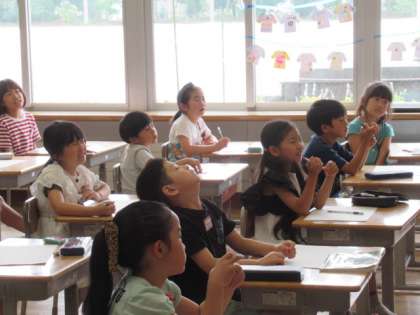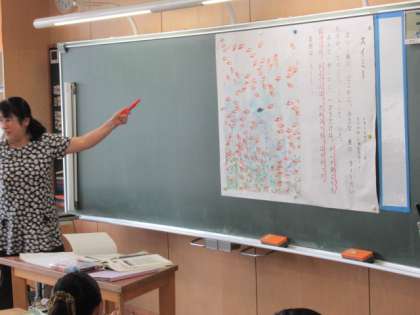 黒板やワークシートに1匹黒い魚が。これがスイミーです。スイミーの学習が進んでいます。