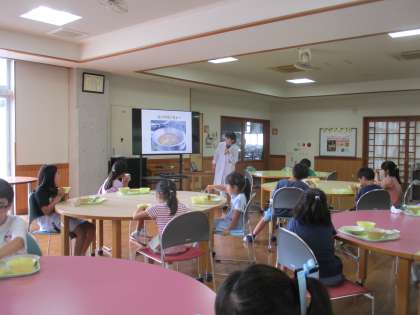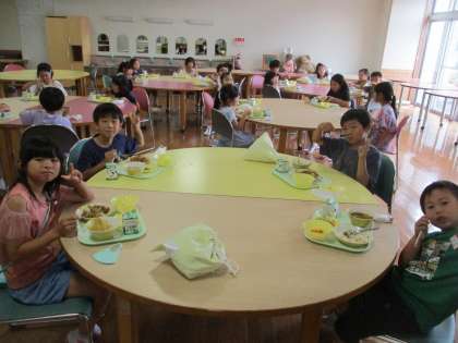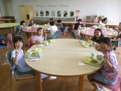 今日のメニューの夏野菜カレーには、ナスやピーマン、トマト等、みんなが育てている野菜と同じものが入っていました。みんなで食べる給食は、やっぱりおいしいですね!