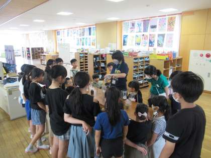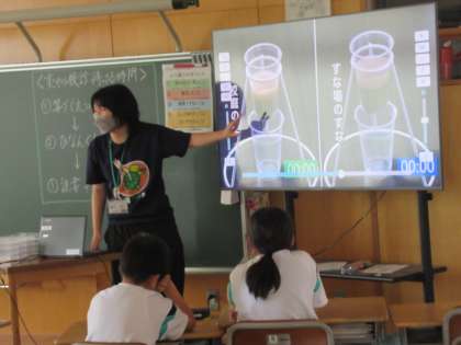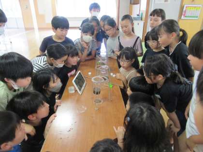 雨水のゆくえについて実験をしました。土や砂等を場所ごとに4種類用意し、それぞれについて水がしみ込んでいく様子を比較しました。子供たちの実験に入り込む表情がすごいです。