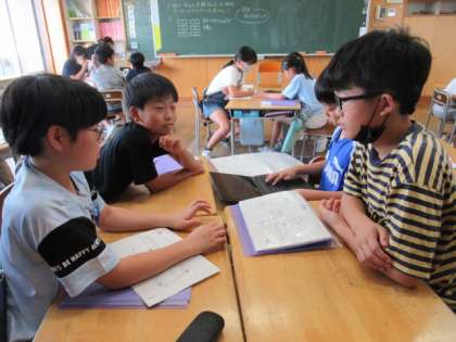 学校にはどんな防災設備があるのか、調べてきたことを班で共有しました。