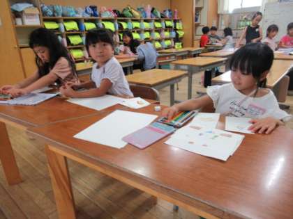学期末の学級集会の準備をしています。かわいいイラストを描いたり、せりふを考えたり。楽しい集会にするために、どの子も意欲的です。