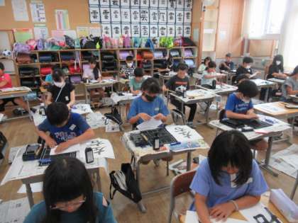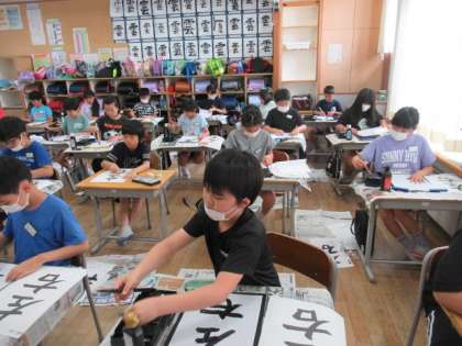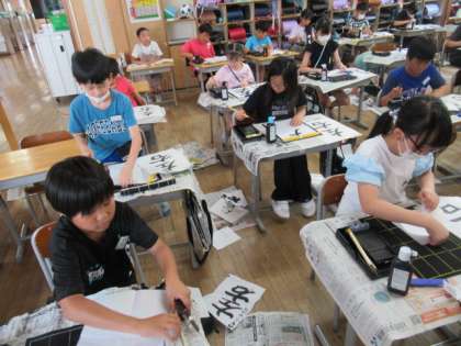 「左右」を清書しました。美しくバランスのとれた文字になるよう集中して筆を動かしている子供たちでした。