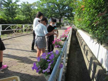 遊歩道のペチュニアの水やりも子供たちはがんばっています。地域の方々のご協力、そして子供たちのがんばりのおかげで、お花は今朝も元気に咲いています。