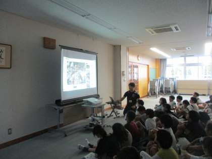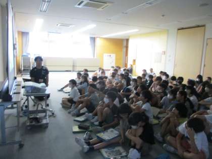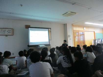 まだまだ暑い日が続きます。グラウンドや体育館で運動するのは危険ですので、本日は走り幅跳びの解説を聞きました。競技場での動き方やルール、そしてオリンピック選手の走り幅跳びの動画を見ました。実際に見てみるとイメージが沸いたようです。世界新記録の跳躍に思わず歓声があがっていました。