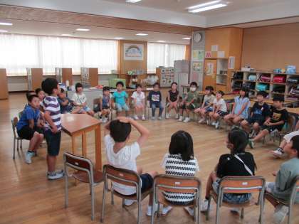 各クラスで、夏休みの振り返りを行いました。おいしかった食べ物、おでかけした場所でのエピソード、頑張って練習した○○などなど。まだまだ話したりないくらい思い出がいっぱいできたようでした。思い出を2学期へのパワーに変えて、頑張りましょうね!