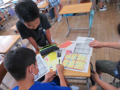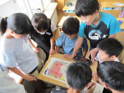 総合的な学習の時間では、災害に対していのちを守る地域づくりについて学習しています。今日は実際に校区の地図を防災マップとして表していきました。これまで調べたことが図面にたくさん表れてきています。