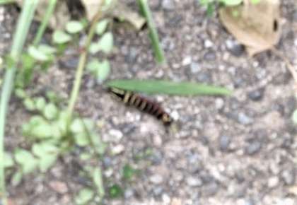 朝の校舎裏のアスファルト通路で子供たちが集まってしゃがんでいます。なるほど、地面には黒と黄色の縞模様の幼虫が。口々にこの幼虫の正体について議論している子供たちです。