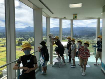 クリーンセンターでの後半は4つの班に分かれて施設内の見学をしました。展望台では広がる眺望にびっくりです。どんどんやって来る収集車の様子はもちろん、眺めでははるか能登半島までのぞむことができました。