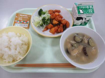 今日の献立は、ごはん、鶏肉とレバーのケチャップからめ、そえ野菜、なすのみそ汁、野菜ふりかけ、牛乳です。