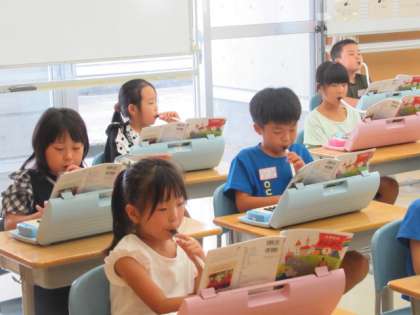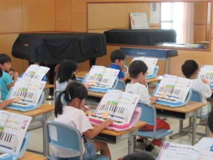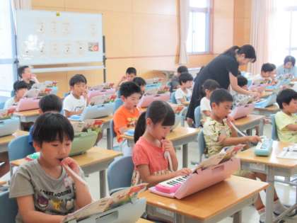 鍵盤ハーモニカの学習を進めています。鍵盤と階名を見ることで、音階の基本的な知識も学ぶことができます。