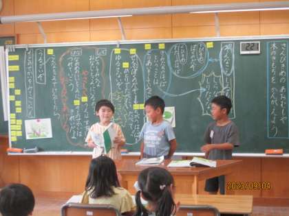 国語科の時間に「やくそく」という話を読んでいます。話に出てくる青虫や木の気持ちを考えました。そして、その気持ちが伝わるように音読しました。怒ったように読んだり、優しく呼びかけるように読んだり、とても工夫して音読できました。