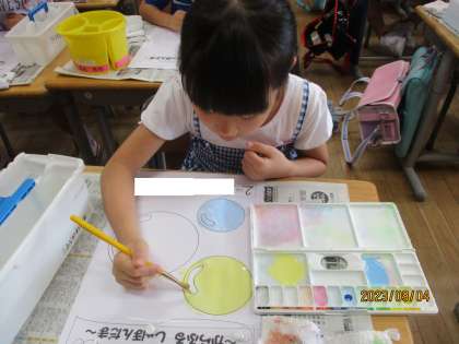 水彩絵の具でシャボン玉に色を塗りました。2つの色を混ぜて、きれいな色をつくりました。一人一人違った色の、カラフルなシャボン玉が完成しました。