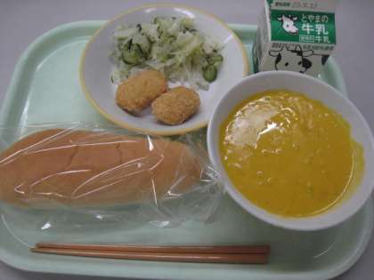 サラダのドレッシングには、オリーブ油、砂糖、酢、塩、こしょうの他に、富山市で生産されたえごまの葉を使いました。えごまの葉は特有の香りがあるため、中には苦手な児童も見られますが、生活習慣病予防に役立つ食品であることを、校内放送で紹介しました。また、かぼちゃポタージュには、生のかぼちゃ、玉ねぎ、じゃがいも、白いんげん豆、生クリーム等が入っていました。こくがあっておいしいポタージュを味わいました。