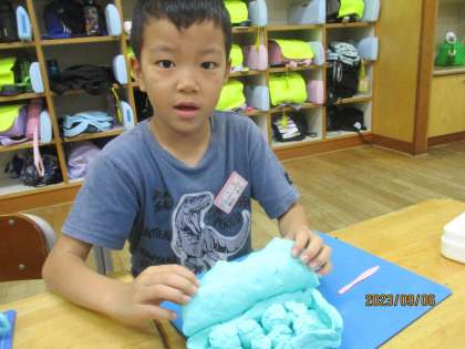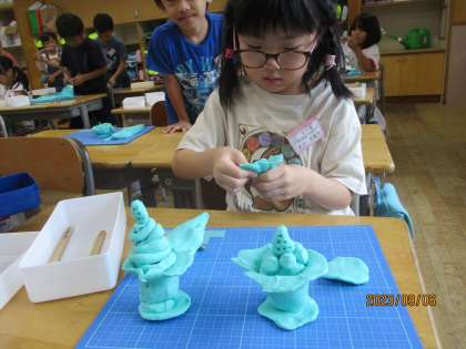 図画工作科の時間に、おいしい食べ物をつくりました。おすし屋さん、アイス屋さんなど、とても美味しそうな食べ物をつくりました。そして、お客さんを呼んで、つくったものを紹介しました。