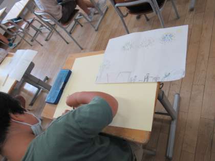 出来事の様子やそのときの気持ちを絵に表しています。遠いものと近いものを明確に表現するよう工夫しています。