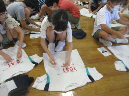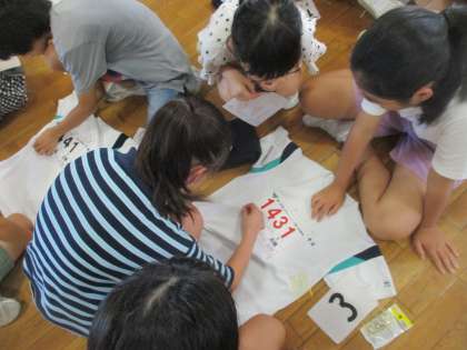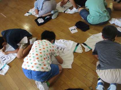 明後日のチャレンジ陸上に向けて、ゼッケンを貼りました。当日はこの体操服で、自分の目標記録に挑戦します。