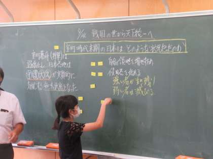 室町時代の終わりはまさしく下克上の世となっていきます。子供たちの興味関心が高まる場面の学習です。教師もアクティビティを交えながら、リアルな学習を仕組んでいます。
