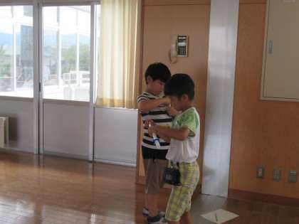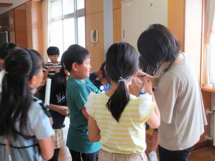 理科では、空気鉄砲を使って実験をしました。先日からたくさんのことを話し合ってきているため、子供たちは空気の「おす力」「おし返す力」について十分に意識をもっています。単に、ポン!ポン!と玉を飛ばすのではなく、そこから「おすときの抵抗感」「おす強さ」「おす速度」等について会話をしている姿に、探究的な構えを十分に感じることができました。