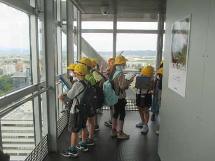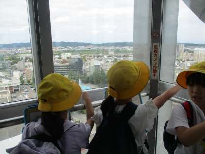 高さ70メートルの展望塔から、富山市を眺めました。「海はどこ?」「立山の上の方は見えないね」「北はどっちかなあ」