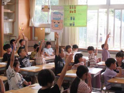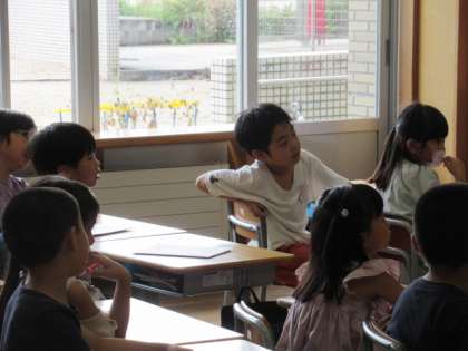 前で発言する子供たちの姿に教室みんなの視線が集まり、学びを深めています。