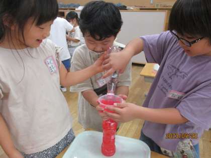 算数の学習で、どちらの水のかさが多いか考える学習をしました。ペアの友達と、どのように調べたらいいか相談しながら、水のかさを比べました。