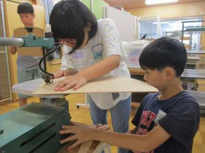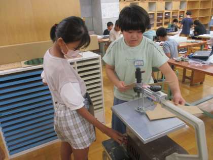 図画工作科では、伝言板をつくっています。板を糸のこで切っていく活動がだんだん慣れてきて、少し複雑な形もスイスイ切っていました。