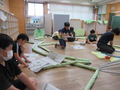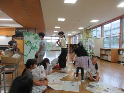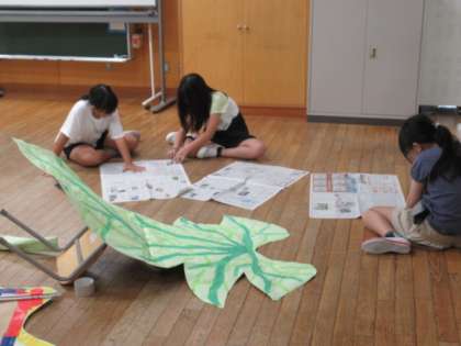 学習発表会に向けて演技に取り組んでいますが、内容が深まるごとに、舞台道具に対してもアイディアが次々と思い浮かんできます。1組と2組の間のスペースは、今はアトリエ。朝登校した子供たちは、さっそく製作を始めています。大きな葉っぱや模造紙をつないだなが〜い茎、衝立にはたくさんの絵、ハンガーラックには天に向かって伸びている立体の葉や茎、これらの道具が演技を十分に引き立ててくれることを期待しています。