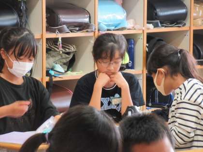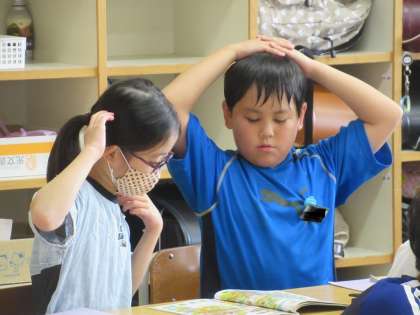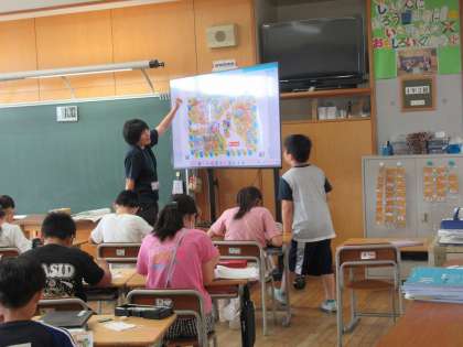 アルファベットの学習をしました。テキストの絵の中には、アルファベットで書かれた文字がいっぱい。提示された文字や言葉を探しながら、ゲーム感覚でアルファベットに慣れ親しんでいきました。競い合って探す子供たちの目がとても輝いています。