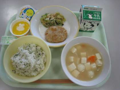 満月に見立てた鶏つくねのあんかけ、白玉だんごが入った汁物、中心のうさぎ型ゼリーがかわいいデザートなど、お月見をイメージした献立を楽しくおいしくいただきました。給食時間の校内放送では、お月見行事についての説明や献立紹介をしました。