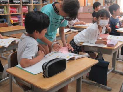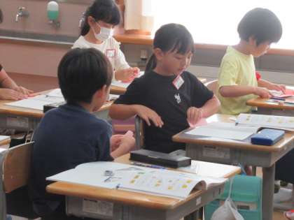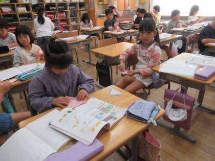 折り紙を折っていくと直角が4つ。そこから長方形の概念について考えていきます。楽しく作業をしました。