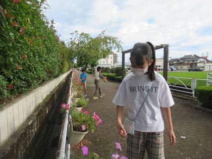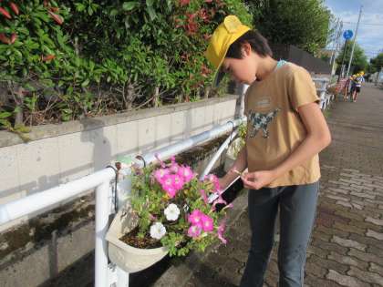 毎日4年生の子供たちがお世話をしてきました。そろそろ季節も終わりになるため、明日と明後日の二日間で片付けることになりました。今朝は、最後の花摘みをしてあげました。残っているお花は今日もきれいに咲いています。