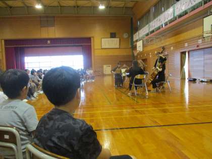 音楽鑑賞では、バイオリンやビオラなどの弦楽器の演奏を聴きました。自分より大きな楽器や指の動きが速いことに驚いていました。