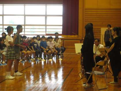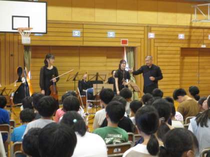 「桐朋オーケストラ・アカデミー」の皆さんによる、弦楽器の演奏を聴きました。バイオリン、ビオラ、チェロ、コントラバスの特徴を紹介していただきながら色々な曲を鑑賞しました。学級により人気の楽器は様々だったようです。素敵な演奏に浸る、優雅な時間となりました。