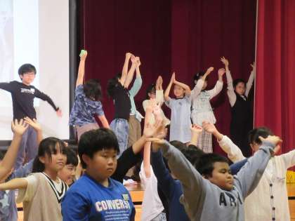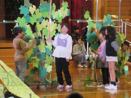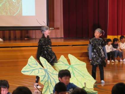栽培しながら、実った実を料理してみたり、暮らしに役立つものをつくったり。4年生の子供たちのヘチマの研究は今も進行中です。これまでの取組の内容を劇や身体表現等を交えてリアルに表現しました。