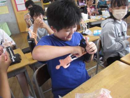 図画工作科の時間に粘土で「未来の自分」をつくっています。逆さまになっている人、寝そべっている人等姿は様々。完成が楽しみですね。
