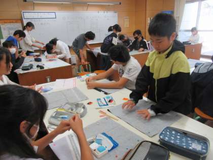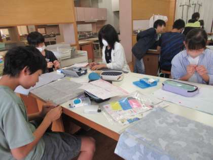 布を半分に折って、脇を縫っていきます。慎重に取り組んでいます。