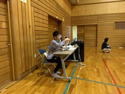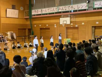 学習発表会の始まりです。はじめの言葉を1年生がしっかりと述べました。学年の紹介は放送委員会の上級生が担当していきます。