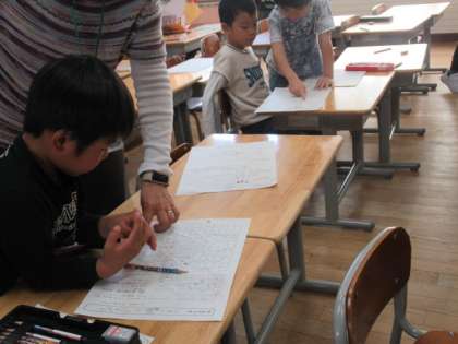 お手本を参考に、正しく文章を書く練習をしました。書き上げたらさっそく先生に見てもらいます。