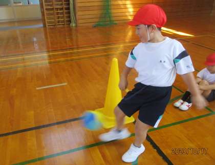 体育の学習では、ボールけり運動が始まりました。○○さん!と声をかけてボールをパスしています。慎重に蹴ったり思いっきり蹴ったり、力の加減に気を付けて上手にパスしていました。