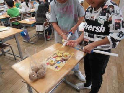 ジャガイモを玉にして実験しています。結果や玉の様子から子供たちは思考しています。