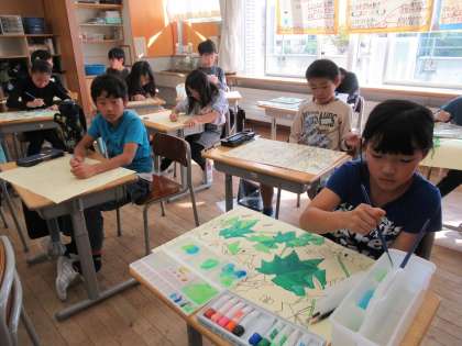 気持ちを落ち着かせ、集中して取り組むために、教室内にはしっとりとした雰囲気のBGMが流れています。子供たちは、その厳粛なムードの中、絵画と向き合っています。ヘチマの葉、花、それぞれに細やかな線描写が表れ、色使いも深まりが出てきています。音楽とアートがリンクし、秋にぴったりの環境です。