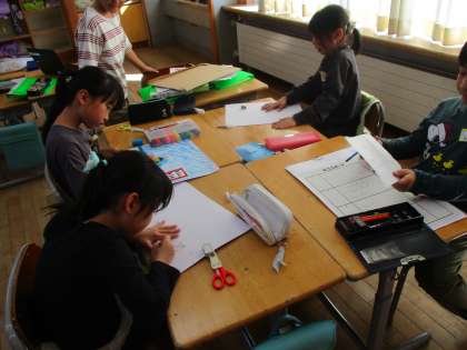 総合的な学習の時間では、学校のみんなに調べたことを伝えるための準備を進めています。おもちゃチームや紙芝居チーム等、様々なチームに分かれて、協力してがんばっています。