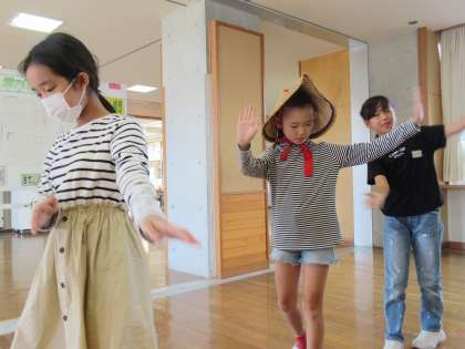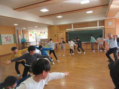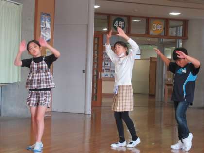 日本の伝統文化に親しむ学習の一つとして「越中おわら」に触れてきました。前回に引き続き、多目的教室で実際に輪踊りを体験してみました。おわらのもつ柔らかさ、ときおりはっ!と登場する切れ味のよさを子供たちは上手に表現できるようになっています。おわらの魅力を体感している子供たちです。