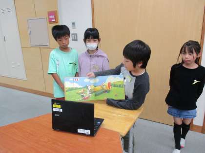 国語科では、「1年生が本を好きになってくれるような読み聞かせをしよう」というテーマで話し合いをし、班で1つの本を決めました。読み聞かせを動画に撮り、1年生に届けました。