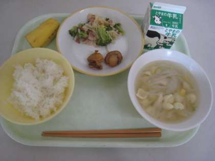 ごはん、ほたてのバターしょうゆ焼き、切干大根のペペロンチーノ、マカロニスープ、バナナ、牛乳
