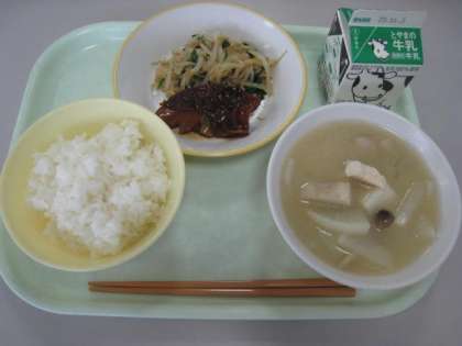 ごはん、赤魚の照り焼き、香味和え、いものこ汁、牛乳