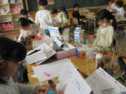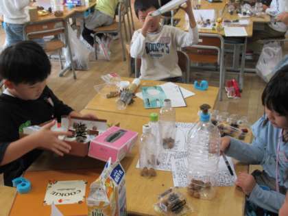 秋の実りを活用したり、身の回りのものを再利用したりしながら、楽しいおもちゃをつくっています。今日は、よりグレードアップさせるために考え、互いに見合いっこもしました。