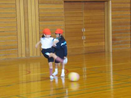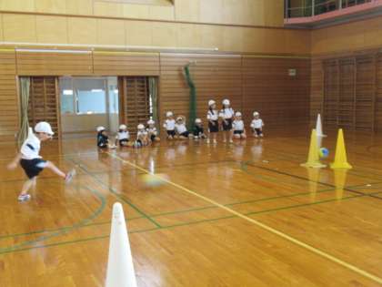 「蹴る」運動のボール蹴り遊びをしました。ねらいどおりにはなかなかボールは向かってくれませんが、やるごとに少しずつ間違いなく上達しています。