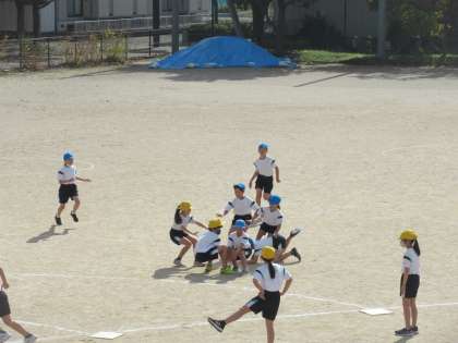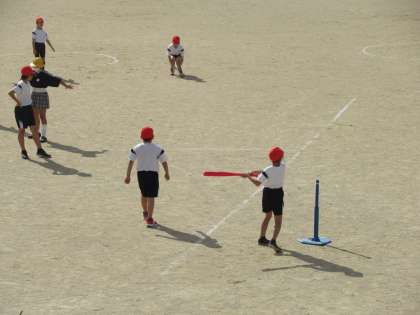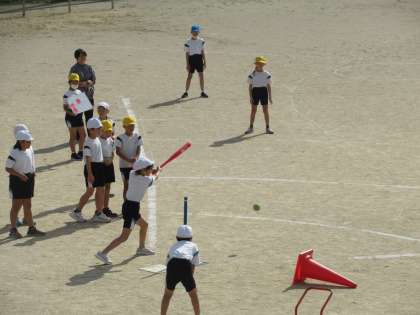 お天気がよかったので、外でゲームをしました。バッティングも守りも上達しています。ゲームでは互いに声を掛け合い、熱いゲームができるようになってきました。