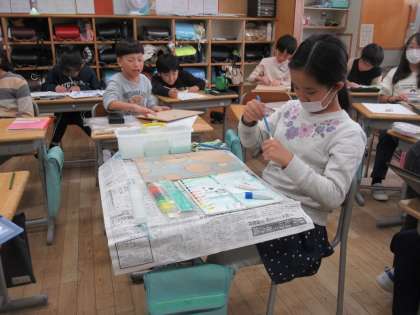 トントンコロコロゲームの製作に取り組んでいます。ゲームの仕組みはもちろん楽しいのですが、加えてボードのデザインがゲームの楽しさに、より大きな影響を与えます。自分の願いに合わせて、ボード部分を丁寧に下描きし、彩色していきました。